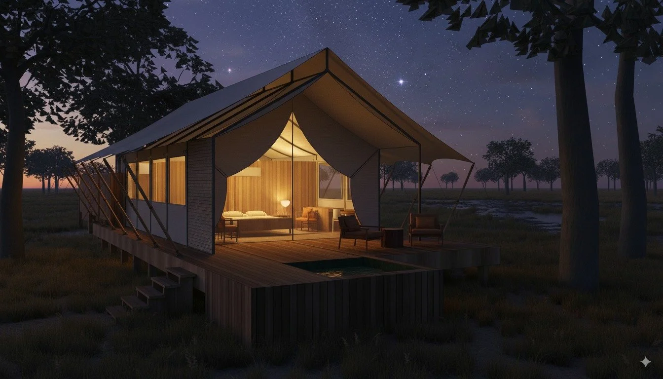Tuludi Explorers Camp is an off-grid ecotourism lodge located on the fringe of a seasonal floodplain in the Okavango Delata in Botswana.